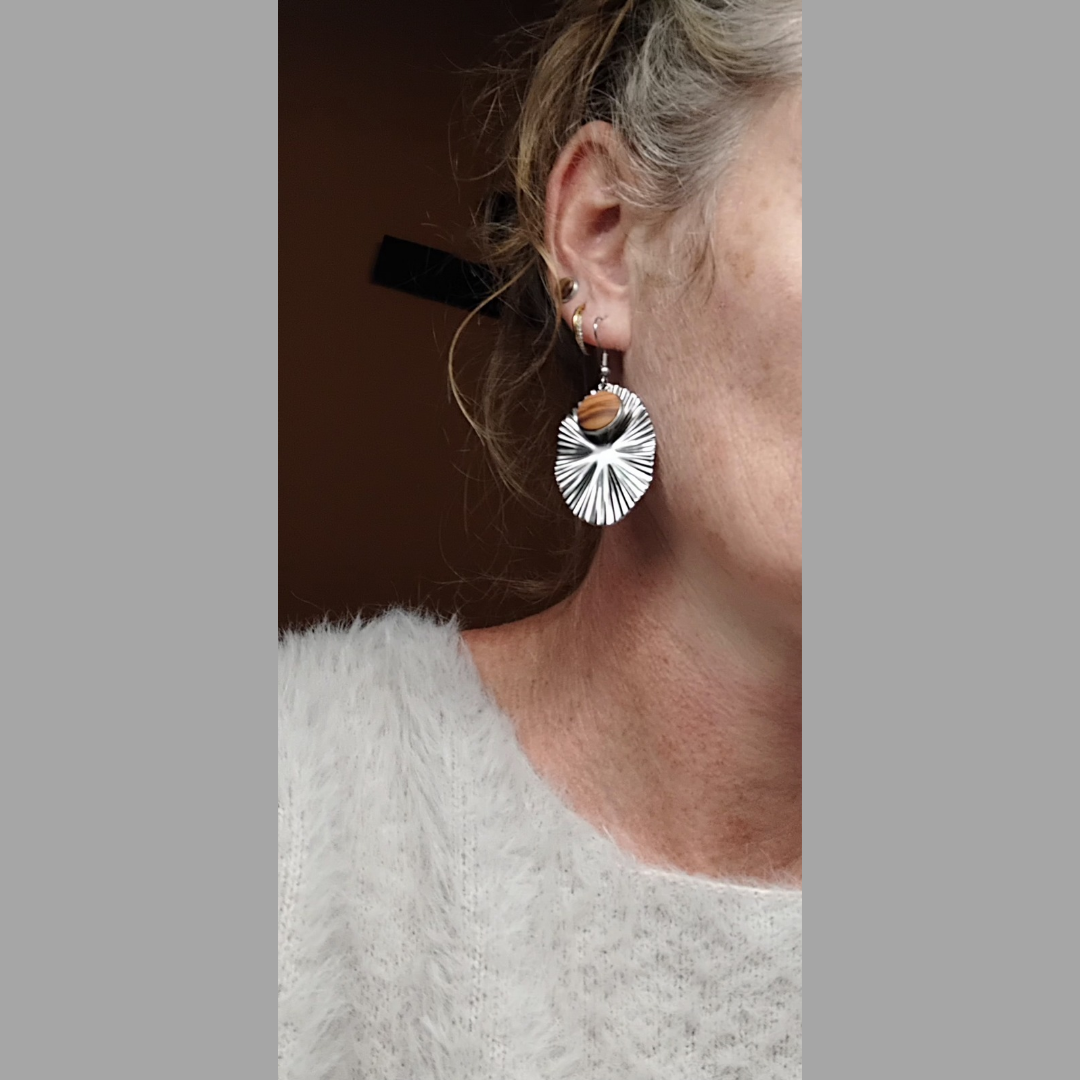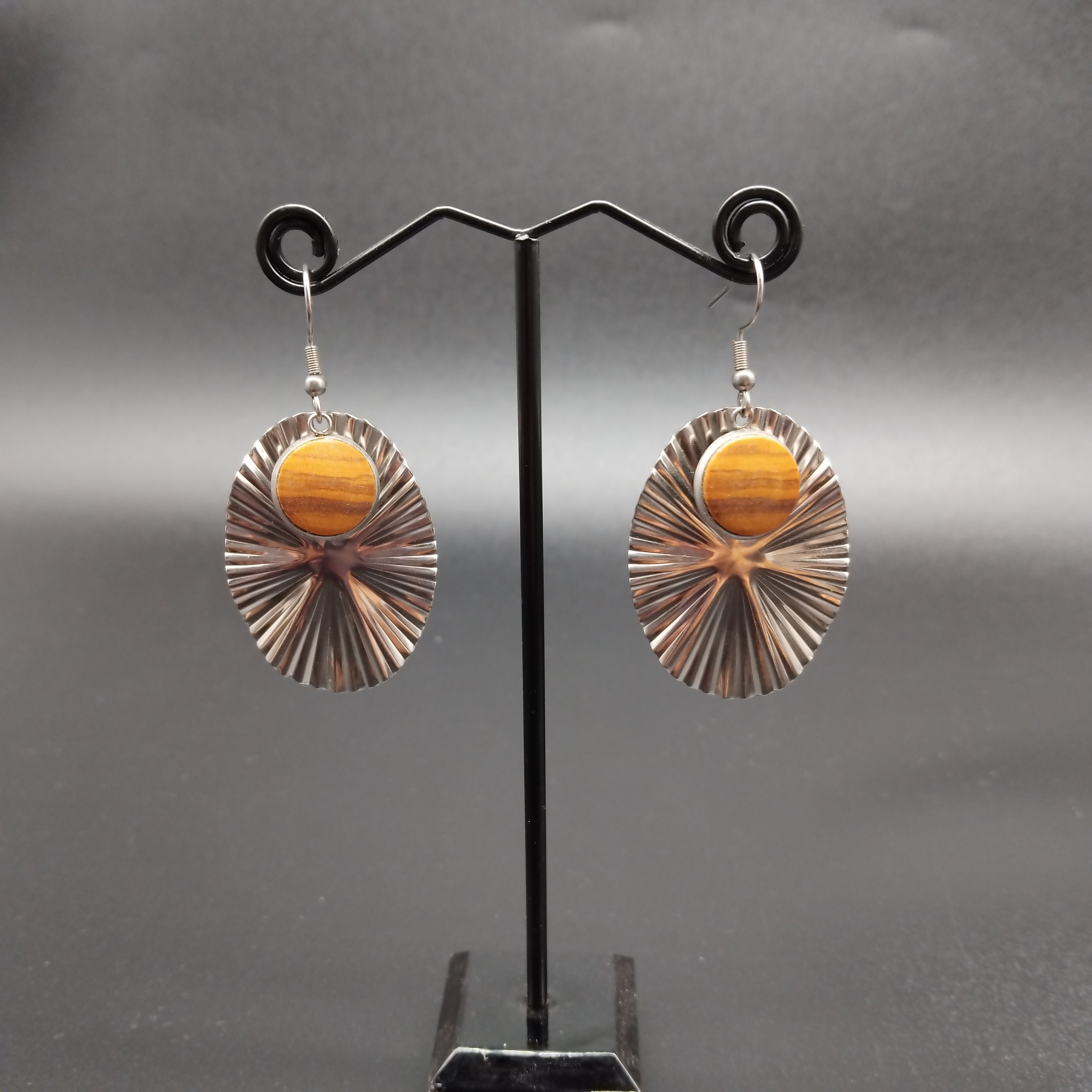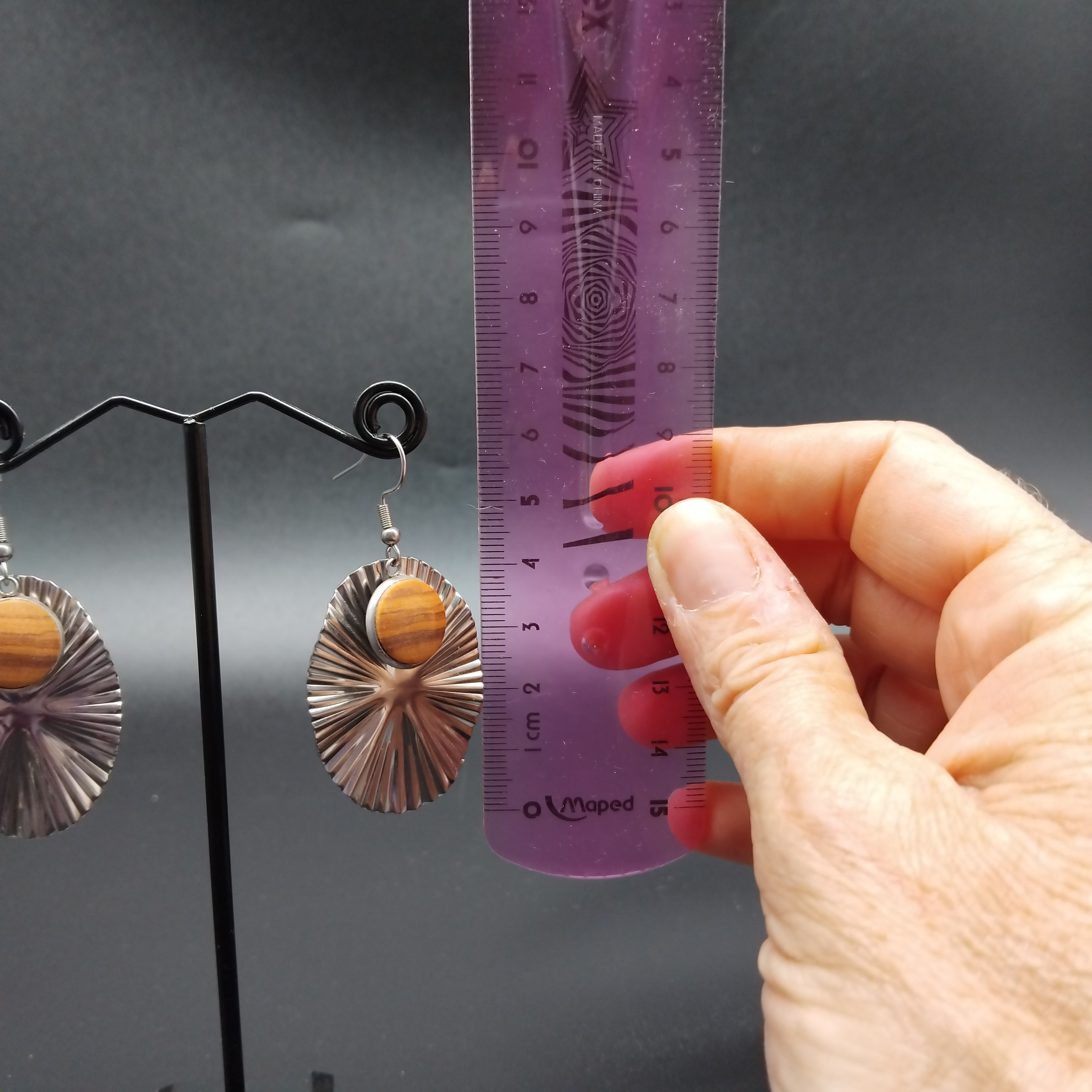 Boucle d'oreilles en acier inoxydable, insert en olivier qui fait pensé à un paysage ?.