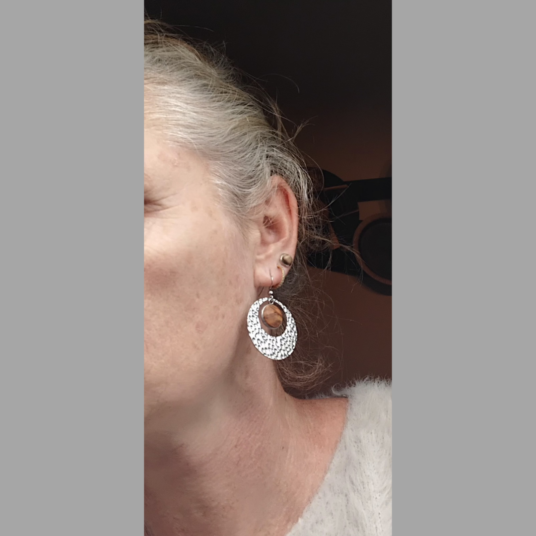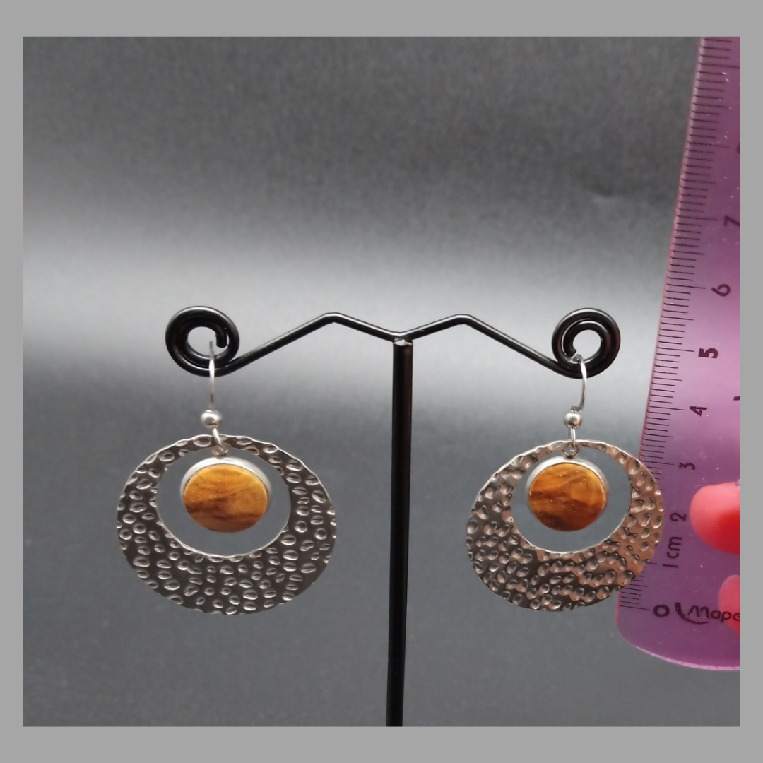 Boucle d'oreilles acier inoxydable martelé ronde avec insert en olivier qui fait pensé à un paysage ?